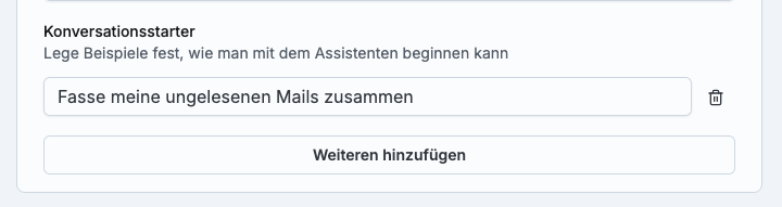 Bei Assistenten können Gesprächsaufhänger hinterlegt werden, um häufig genutzte Prompts schneller zugänglich zu machen.